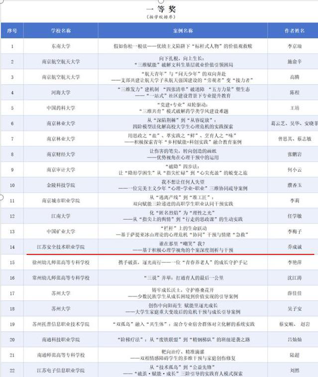 近日,江苏省高等教育学会辅导员工作研究委员会公布了2025年全省高校辅导员工作案例评选结果,我校辅导员乔成诚老师撰写的案例《谁在那里“嘲笑”我?——基于积极心理学视角的个案深度剖析与干预》荣获一等奖,实现在该项目上的新突破。